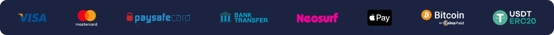 Visa, Mastercard, Maestro, Neosurf, MiFinity, Bitcoin, Ethereum, Litecoin, Bitcoin Cash, Dogecoin, and USDT. For crypto, you’ll receive a one-time address via the cashier—send the exact amount and wait for confirmations.