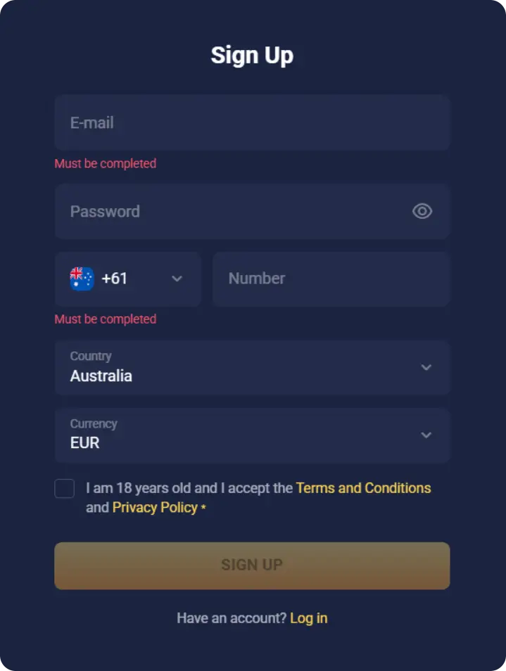 3. Enter your email, create a strong password, and tick the 18+ confirmation box.
